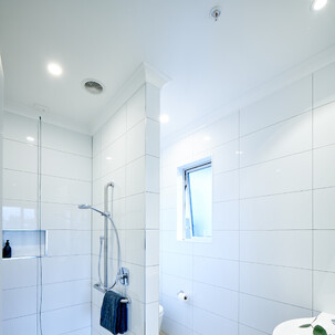 Bathroom with shower and slip-reduction flooring